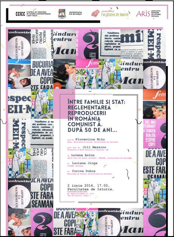 Centrul de Cercetări în Istorie Contemporană "Cont*texte" (Facultatea de Istorie, Universitatea din București) în parteneriat cu Asociația Română de Istorie Socială (ARIS) vă invită la masa rotundă "Între familie și stat: reglementarea reproducerii în România comunistă. După 50 de ani...." La jumătate de secol de la emiterea „Decretului 770/1966 pentru reglementarea întreruperii cursului sarcinii” vom analiza contextul, implicațiile sociale și urmările (ne)promovării accesului la contracepție modernă și avort în România comunistă și post-comunistă.